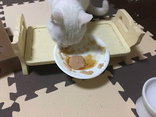 やっぱりCIAOプチは食べにくそうだったので、潰してあげて、あとお皿も押さえてあげましたけど。